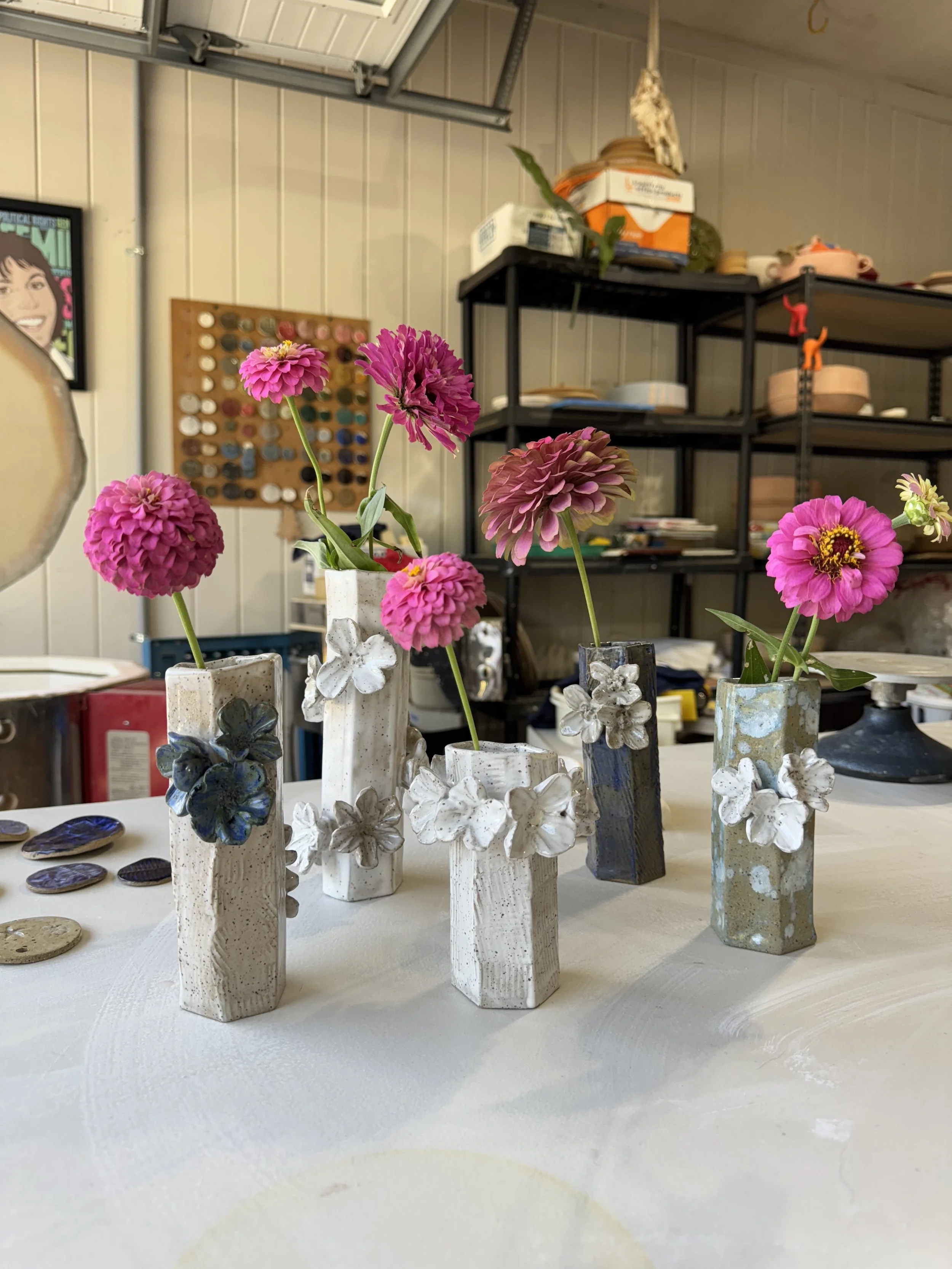 Often our creations are a combination of what Rachel, Abby, and Sandy are playing with in the moment. For example - Sandy was exploring clay flowers while Rachel extruded hexagonal pipes and the flower vases were born.